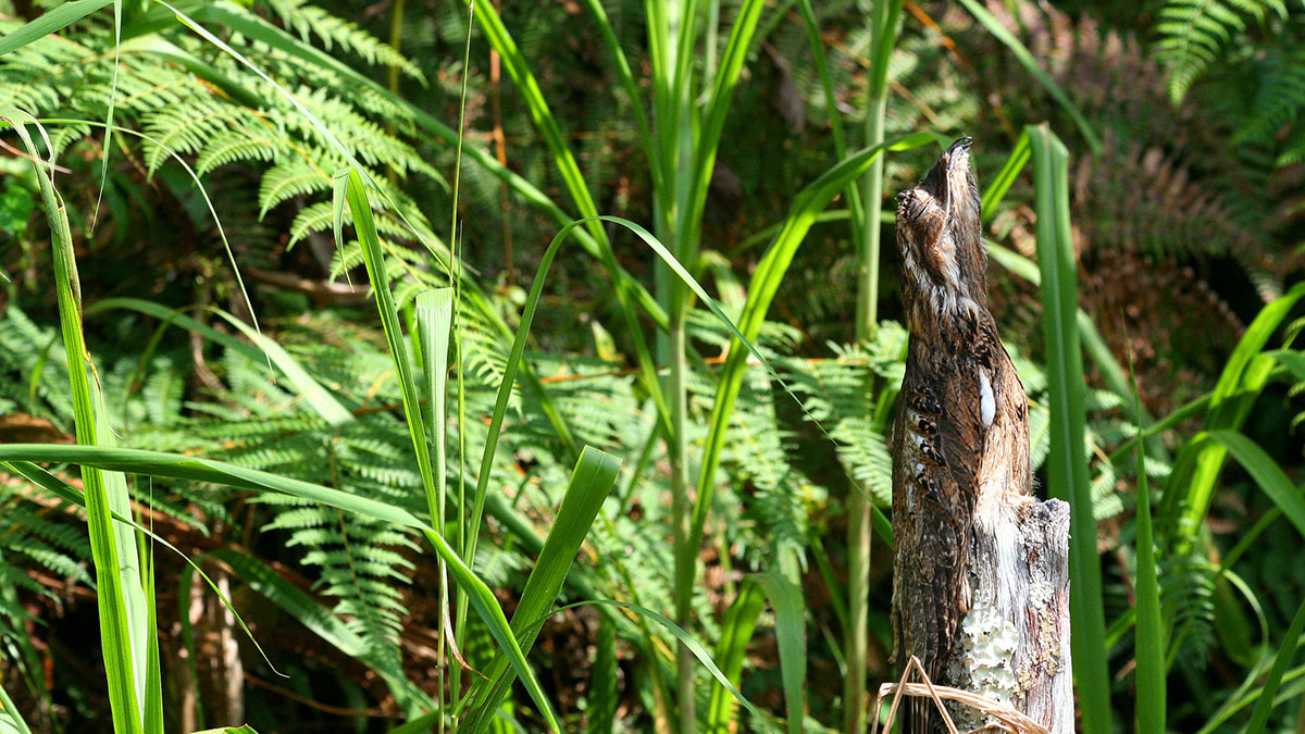 A common potoo (Nyctibius griseus) remains lethargic throughout the hottest hours of the day